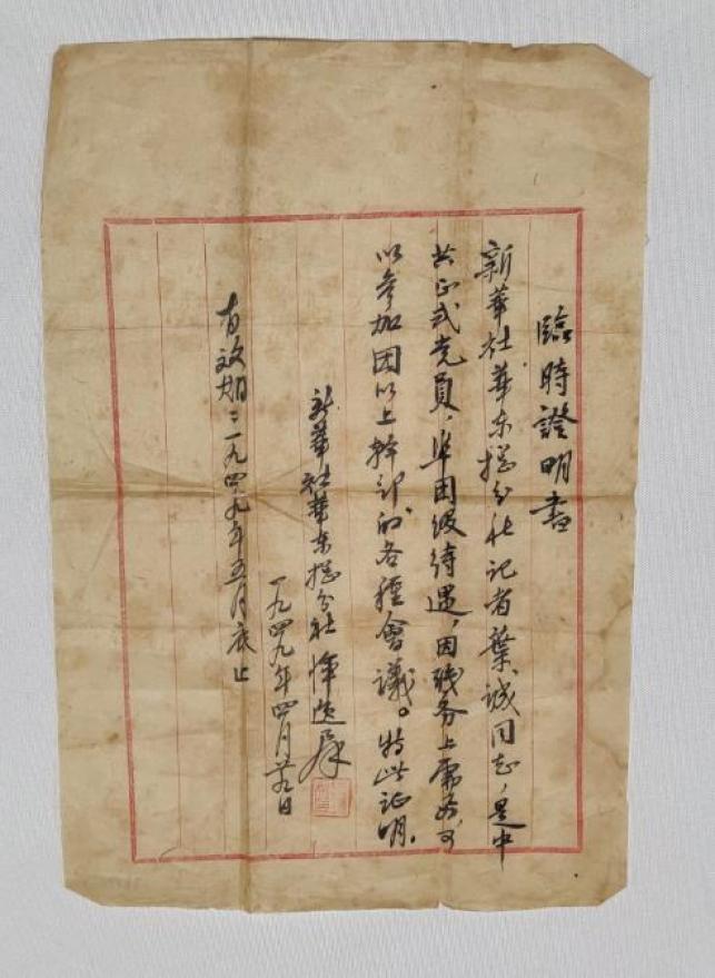 略微泛黄的“临时证明书”咋一看只是薄薄的一页纸,但却让持有者叶诚在半个世纪后回想起来仍有“历历开元事,分明在眼前”之感。叶诚当时是从解放区先期进入上海的新华社第三野战军总分社记者。从丹阳动身时,总分社副社长恽逸群亲手交给他两张“采访证”,其中这张就是恽逸群亲笔书写的“临时证明书”,便于叶诚在地方单位采访时使用。