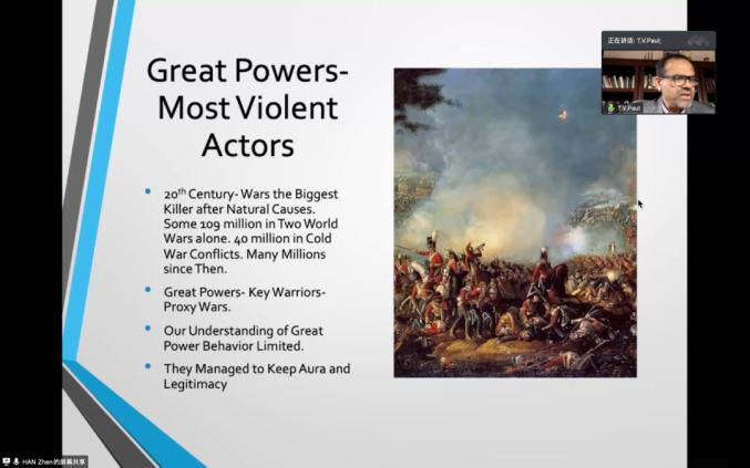 8月12日晚,麦吉尔大学教授、国际研究协会前主席T.V. Paul结合其新书《软制衡:从帝国到全球化时代》,对软制衡理论作了精彩阐述。他对不同历史时期主要大国综合运用硬制衡、有限硬制衡和软制衡手段的经验事实做了梳理。冷战后,使用军事手段的硬制衡式微,各国越来越依赖制度、有限的协约以及经济手段来制衡其他大国,这种制衡就是软制衡。Paul教授认为,软制衡可以追溯到更加久远的17世纪,而不是局限于后冷战时代。历史上的大国总是更具有暴力性,当前世界格局也出现了新一轮的大国竞争。虽然特朗普政府以及其它大国的崛起使得经济全球化、国际规范扩散等受到了挑战,从而使得硬制衡的回归成为一个讨论的话题。但是,为了使得权力和平转移,应采取一种既包括有限硬制衡又包括软制衡的混合手段。最后,Paul教授回应了对实证经验、效果保证、适用范围等一些方面的质疑。格里菲斯大学教授贺凯、不列颠哥伦比亚大学政治系助理教授韩真、清华大学国际关系研究院教授刘丰分别就软制衡理论和实践有关的问题与Paul教授作了深入探讨。