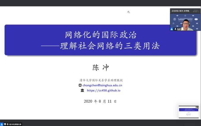8月11日晚,清华大学国际关系学系助理教授陈冲分享了社会网络在国际关系中的三类用法。他从国际关系中“相互依赖“这一概念出发,讨论了传统上对相互依赖在理论和方法理解上存在的一些不足,着重介绍了社会网络分析作为理论工具、测量工具和统计推论工具如何处理国际关系对相互依赖在理论和实证上存在的问题。陈冲老师结合自己在领土争端问题、跨界族群问题、内战中的结盟等议题的研究,介绍了行为体产生相互依赖的机制和路径,以及如何使用社会网络进行理论建构和实证检验。他指出社会网络的分析单位非常广泛,不仅仅可以运用在传统的以国家作为网络行为体的研究,而且几乎可以扩展到国际问题研究的所有领域。他分享了目前社会网络在国际关系中的前沿应用成果,尤其是网络分析在推动有关地位、冲突叛乱组织早期的形成和发展、国际防御协定等议题的研究。他认为,目前学界对于网络的形式和行为体的互动方式已经大为拓展,对动态网络的研究开始繁荣,传统上的国家已经不再是网络分析中唯一重要的行为体,表明网络分析研究突破了传统思维方式,对网络行为体更为丰富创新的定义直接推动了基于网络分析的新理论成果的产生。
