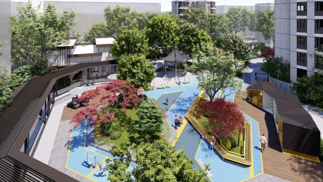 “多节点”即街道交通节点,改造小区现有的公共节点,在健康漫步带的基础上,增加景观停留空间,增加居民休闲活动和交流空间。