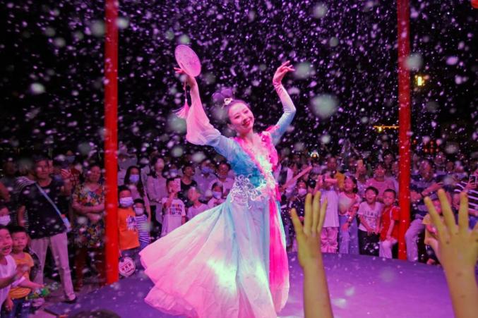 冷冻街乐队、他方世界等摇滚乐队陆续登台,燃爆现场。现场通过电子大屏、卡通发光体、LED灯带、时尚灯箱等亮化布置,将湖山夜空与广场市集完美融合,成为新晋网红打卡点,让“看最嗨的演出、逛最潮的夜市”成为一句流行口号。大报恩寺遗址景区在长干故地打造了“长干里潮玩街”,周末晚上,这里就成了传统文化与时尚元素融合的大舞台,杂技、魔术、舞蹈、室内乐……周周不重样,次次有惊喜。