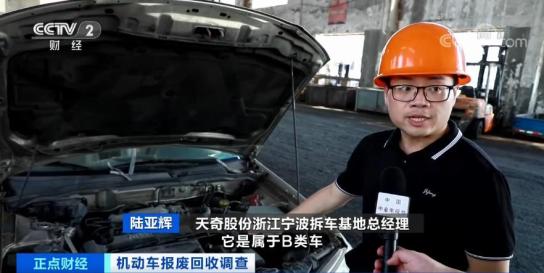 ❒天奇股份浙江宁波拆车基地总经理 陆亚辉:这辆车按照标准属于B类车,我们看中的就是它发动机的总成,它经过再制造可以达到使用的状态,按照500元一吨,支付给车主可能只有750元,但是如果按照新的准则实施以后,对这辆车会给出一个相对更高的价值。