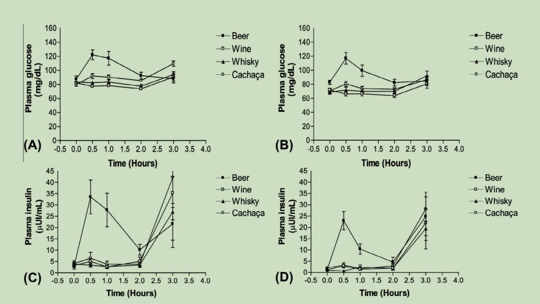 2 Nogueira LC, Couri S, Trugo NF, et al. The effect of different alcoholic beverages on blood alcohol levels, plasma insulin and plasma glucose in humans. Food Chemistry, 2014, 158(11):527-533