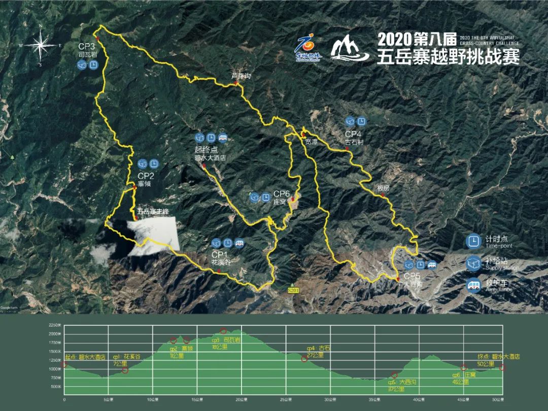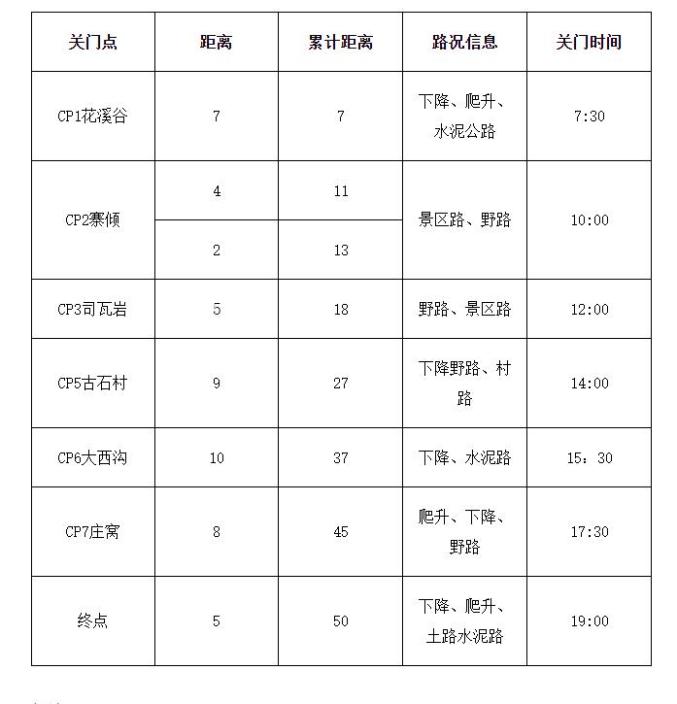 50KM越野赛线路:碧水大酒店(起点)→CP1花溪谷7KM→CP2寨倾11KM→五岳寨主峰→CP3司瓦岩18KM→芦芽沟→CP4古石27KM→板房→CP5大西沟37KM→宽溪→CP6庄窝45KM→碧水大酒店(终点50KM)。