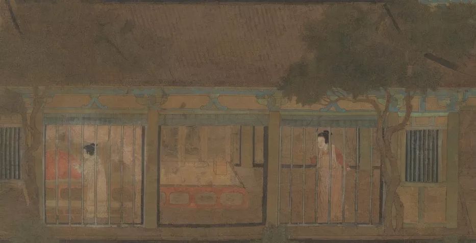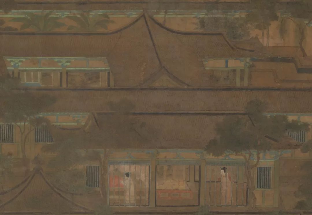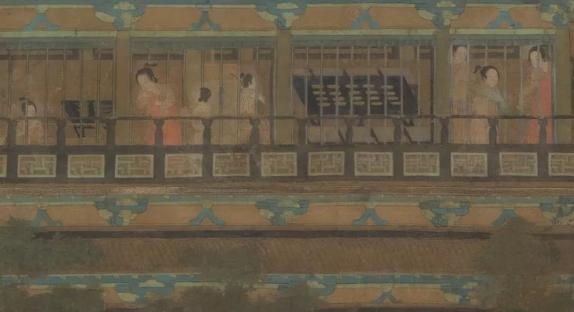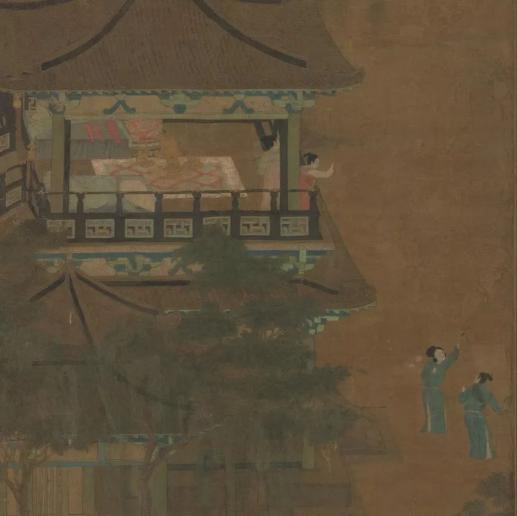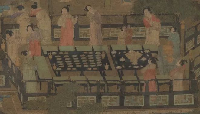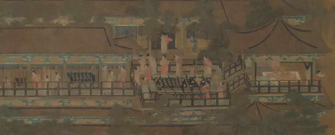 在这幅画中,虽然没有看到用锦缎结成的彩楼,但是设色艳丽的屋宇,也营造了欢愉的节日氛围,而且宫人们也早已将宴饮器具摆放整齐,互相攀谈着,姿势神态各异。