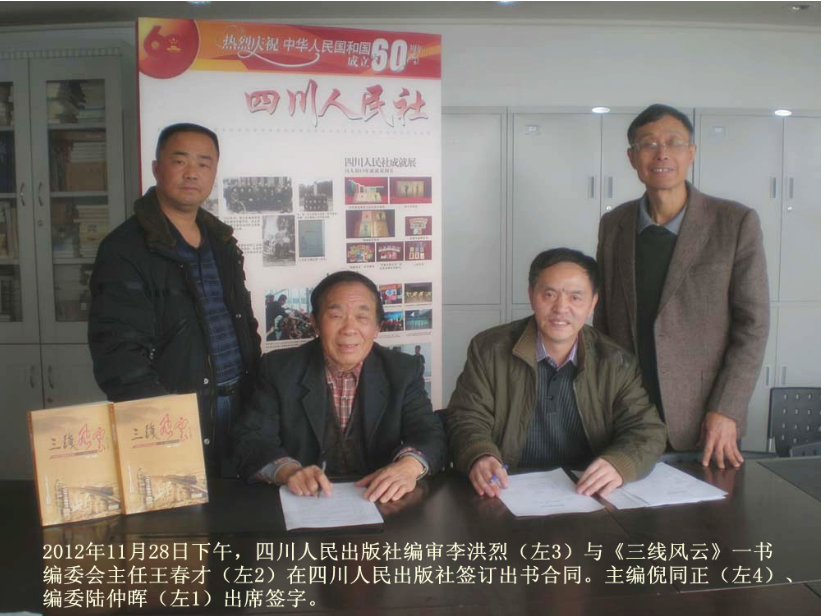图为2012年11月28日,四川人民出版社编审李洪烈(左3)与《三线风云》一书编委会主任王春才(左2)在四川人民出版社签订出书合同。主编倪同正(左4)、编委陆仲晖出席签字