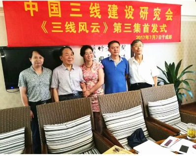 图为2017年7月7日,《三线风云》第三集首发式,左起主编张鸿春、编委会主任王春才、编委刘常琼、责任编辑李洪烈、副主编倪同正
