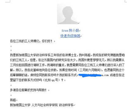 2013年2月26日,在锦江人的百度贴吧上出现了一位新加坡大学在读博士生“陈小超”关于三线建设研究的求助信息,我看到这个信息之后,就回复他说:可以啊,你先把你的简历和联系方式发给我,之后我们就通过电子邮件的形式进行沟通吧。因为当时很多老同事都对这件事情感到有点意外,他们非常奇怪这样一位来自新加坡的博士为何偏偏对山沟里的三线建设感兴趣。当我把我和陈超的沟通内容在贴吧里公布后,大伙才知道陈超原本就是中国人,只不过是去新加坡读博士而已。他选择这个研究主题仅仅是写博士论文之用,没有其他的用意,因此才使得一些老同志放下了戒心。相反,还有部分人甚至将他视为一种希望,希望借此能够获得更多人的关注,从而在退休待遇、社会保障、医疗服务等方面得到更多的关心,这显然是超出陈博士的能力范畴的,当然这种心情也是可以理解的。