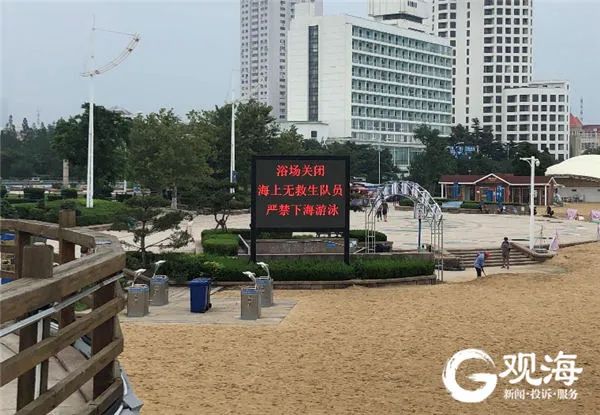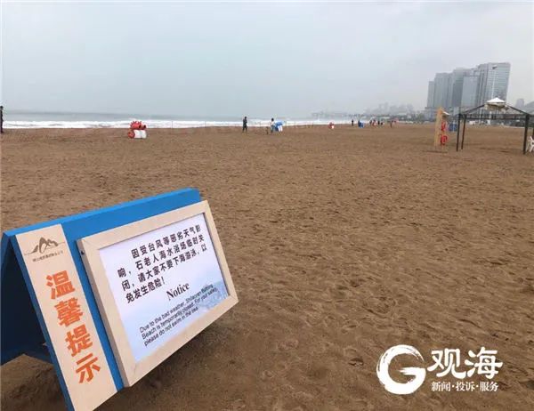 第一海水浴场电子显示屏活动播出“受台风影响,浴场关闭”的提醒,广播中也反复播放台风提示,提醒广大市民浴场已经关闭,请勿下海游泳并远离沙滩。
