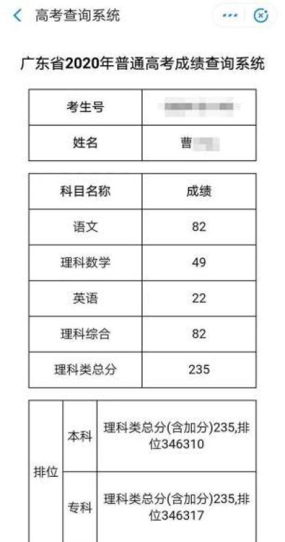 曹灿父亲知道这件事后,拉着儿子去查高考成绩,不查不要紧,一查差点气晕过去。
