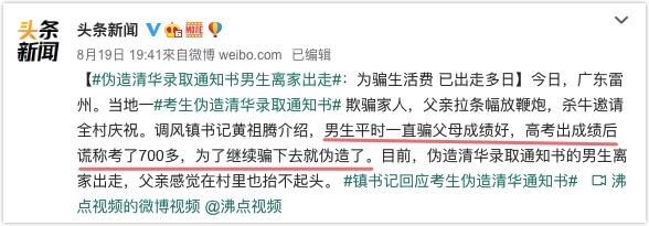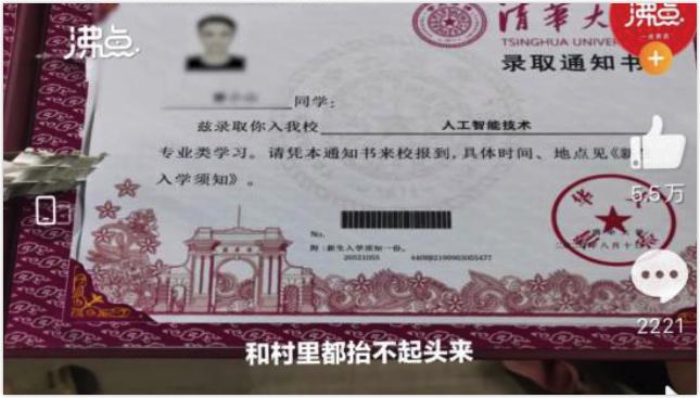 有人发现这份录取通知书不对劲——不仅格式和颜色与清华大学录取通知书不一样,还有很多错别字。“高等学历”写成了“高度学历”,“报到时间”写成了“报道时间”。
