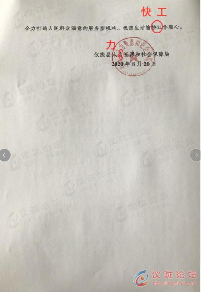 最离谱的是,回复最后的落款也搞错了。仪陇县人力资源和社会保障局,“人力”写成“人为”了。落款和公章明显不一致,不知道这鲜章是咋盖上去的。