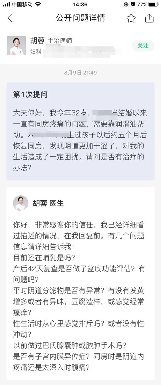 第一,有的妇科疾病比较麻烦,来门诊看一次两次不能彻底解决问题,或者本身有些问题患者可能不清楚、回家又想起来了,又或者拿了药,回家之后想不起来怎么吃,都可以在线随时提问,不用每次都跑医院。