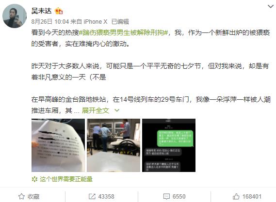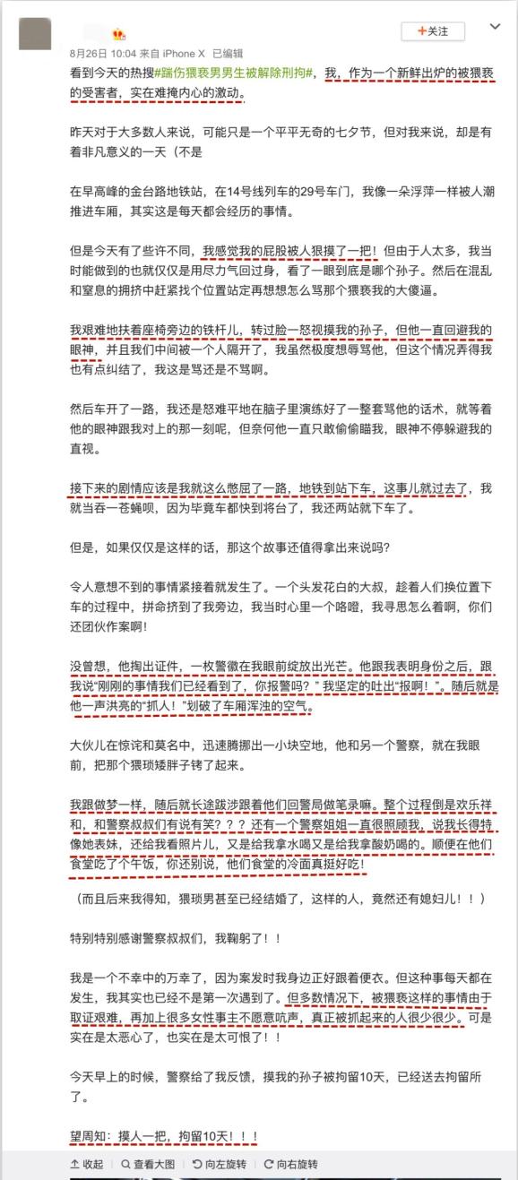“望周知:摸人一把,拘留10天!”微博长文中,有女孩在地铁上遭陌生男性“狠摸一把”时的愤怒与纠结,有警察叔叔“从天而降”时的意外,有警察姐姐给酸奶喝、留在警队食堂吃冷面时的温暖,更有不法分子“摸人一把,拘留10天”的大快人心。