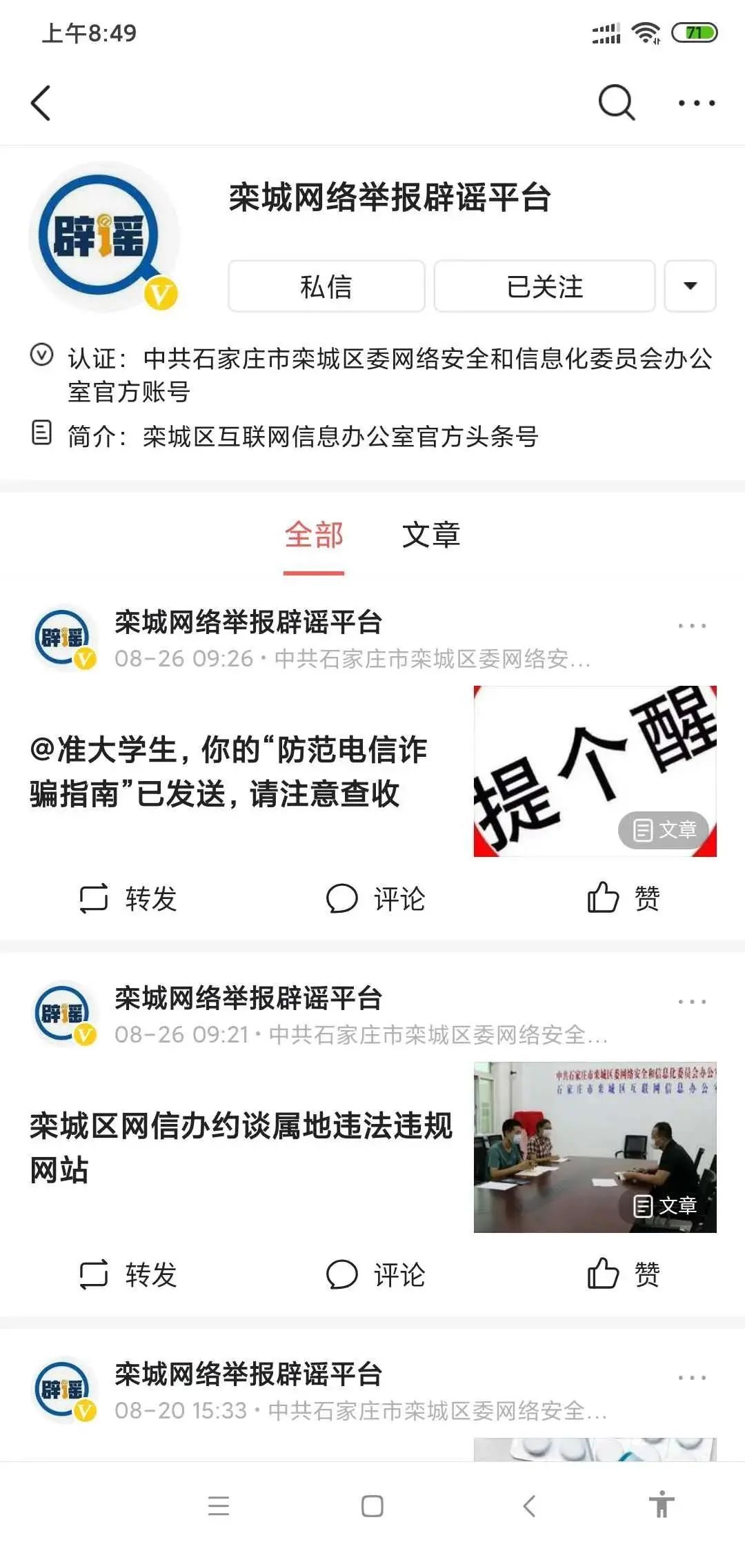 “网信栾城”微信号底部菜单“网络举报”栾城区委网信办在做好日常网络举报及辟谣工作基础上,还在全区开展了“高考专项网络辟谣工作”、“网络侵权举报‘利民互企’专项行动”、“互联网新闻信息内容自查自纠专项行动”等系列活动,统筹全区“一张网、一盘棋”,进一步批驳网络谣言、打击网络侵权行为、治理各类违法违规不良信息,与全社会一道共建共享网络文明家园。