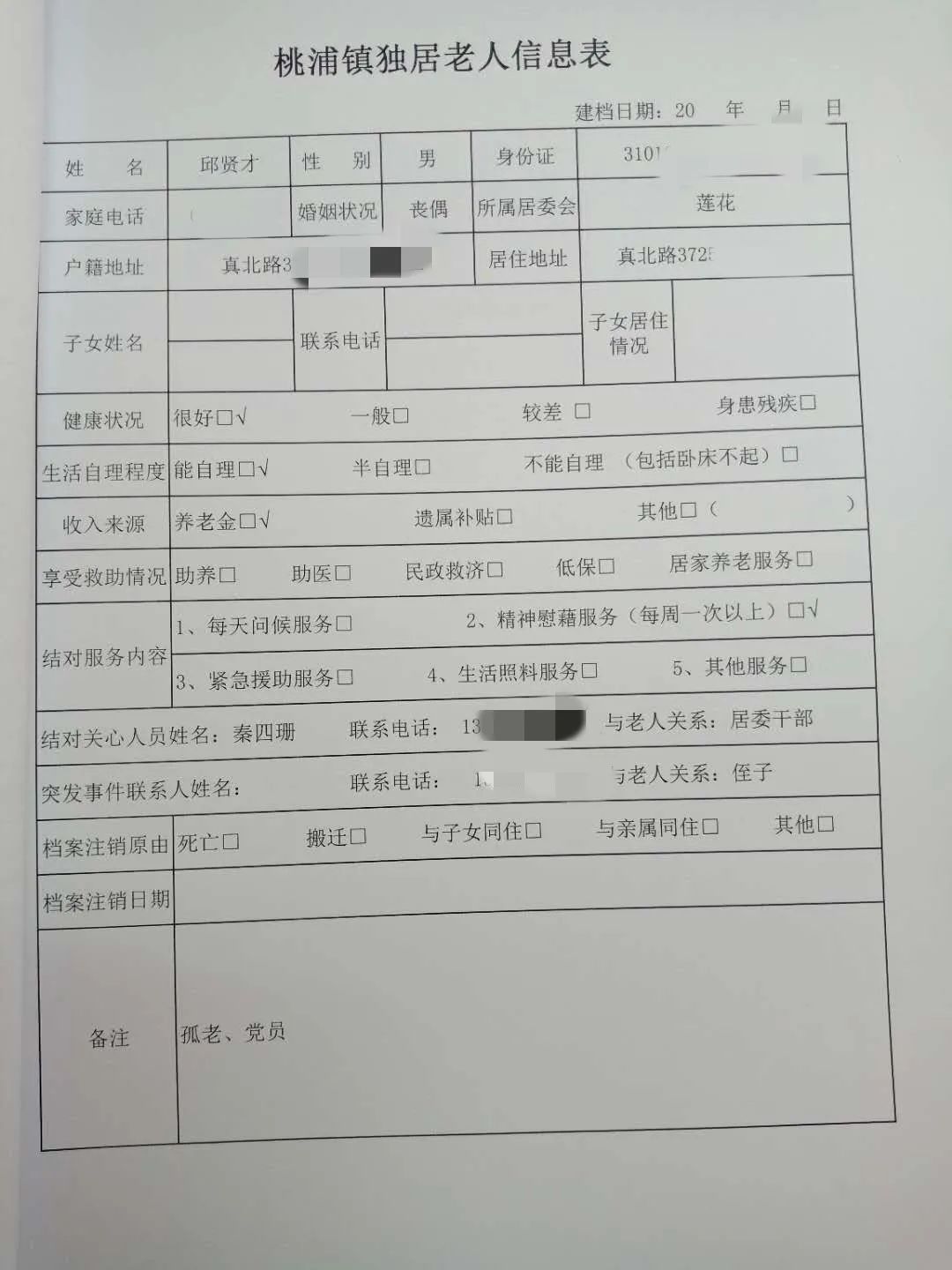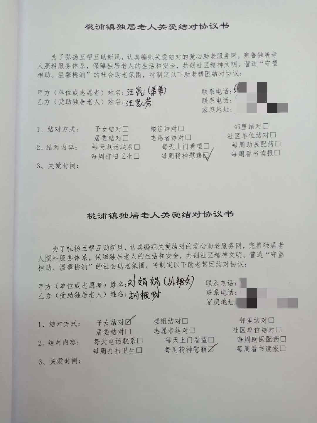 针对高龄、独居、孤老、困难老人,实行关爱台账制度和老伙伴志愿者结对制度,居委会定期上门看望和电话慰问了解老人的实时情况,并及时做好记录。