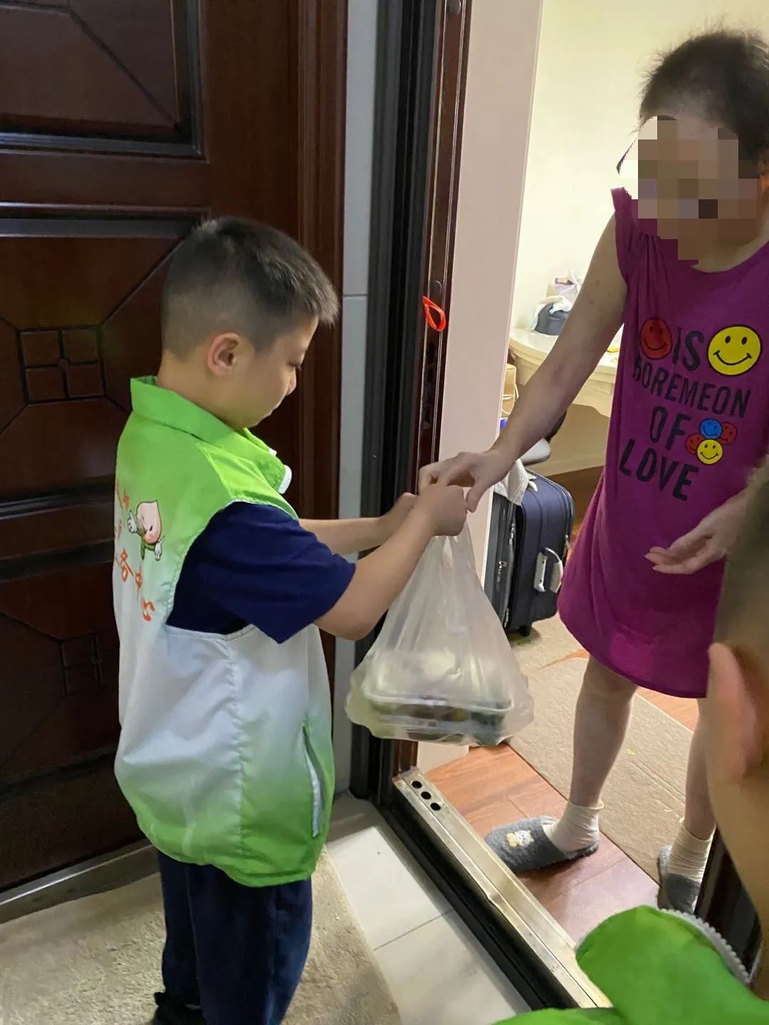 为了解决老人吃饭问题,各居委会工作人员按时将助老餐送上门。暑期里还邀请了社区小朋友化身“送餐员”,为社区老年人送上助老餐。居委会工作人员将门牌号发放到小志愿者手中,小志愿者们按照这些地址,自己进行分工送餐。别看他们年纪小,做起事情有模有样,分工明确,热情周到。