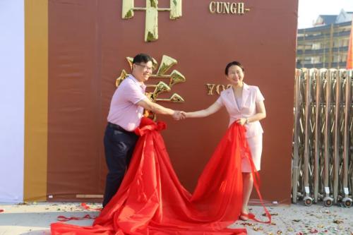 市教育体育局局长张雪玲(右),来宾市第一中学党委书记、校长黄怀芳(左)为一中新校区揭牌。