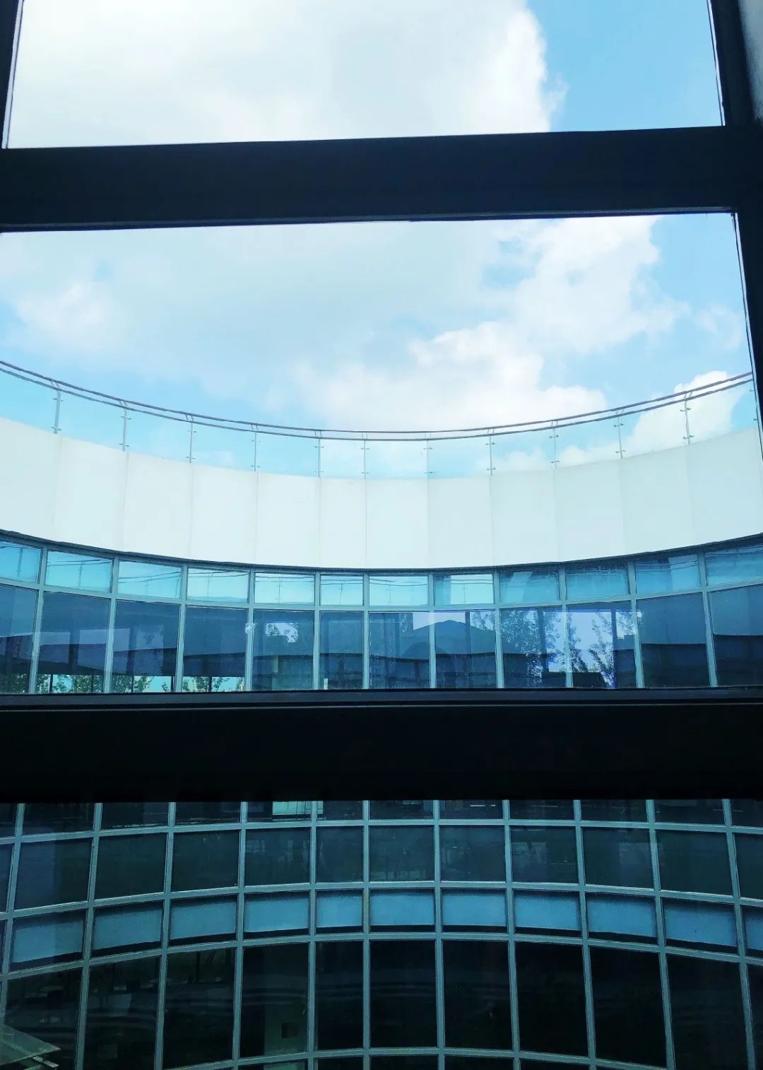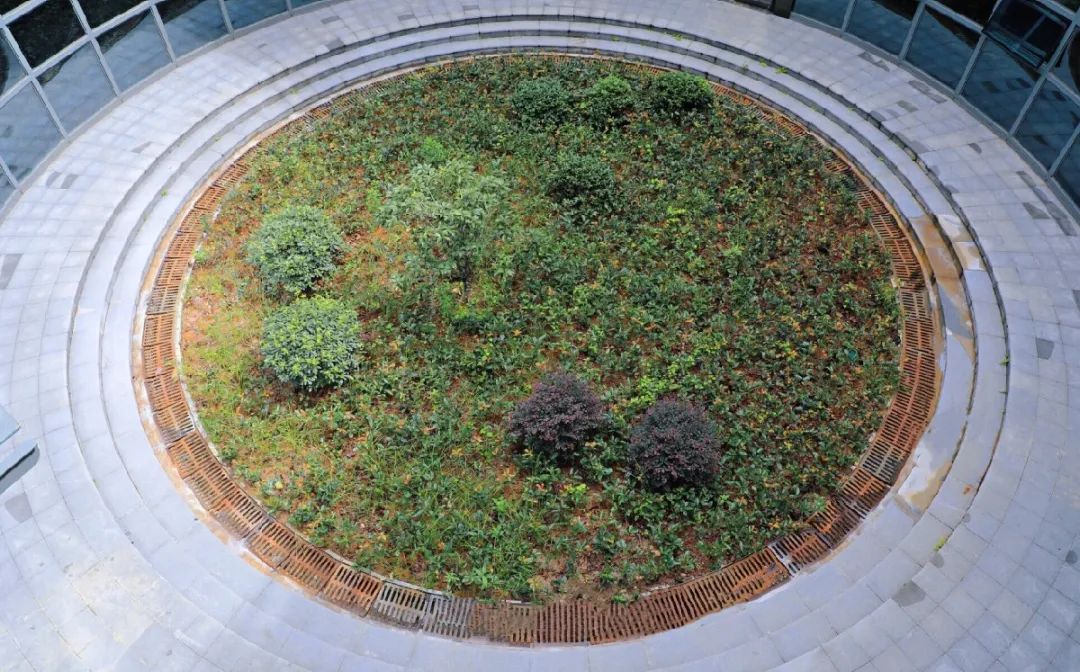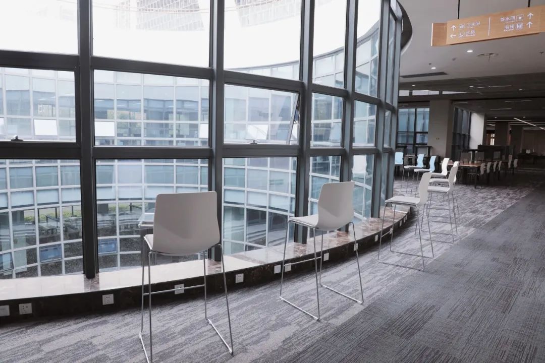 位于图书馆正中的是一个环形天井,围着天井放置了一圈高脚椅。同学们如果觉得看书看累了不妨望个空发个呆,想象下在阳光明媚的午后,偌大的落地窗上透过的丝缕阳光,也许会给大家带来一番别样的感受……通过图书馆一楼可以进入到环形天井内部,包括一楼东南西北四个方向也另外各有四个小型天井,每个天井中都种了些许绿植以供观赏,休憩之时,来这里深吸一口气做个肺部SPA,也是一个不错的选择哦~