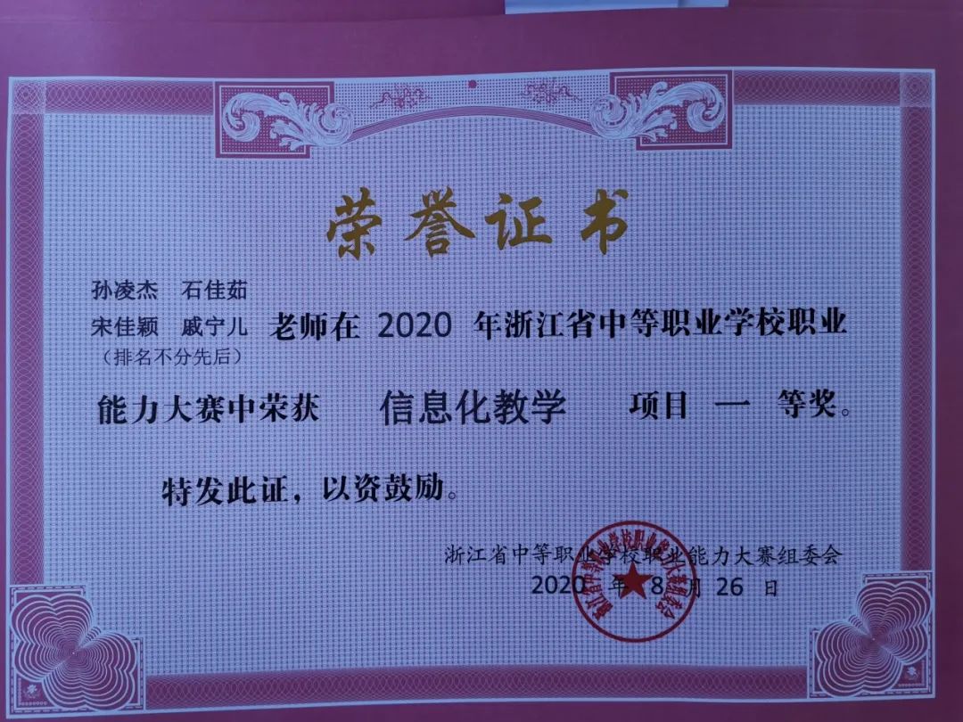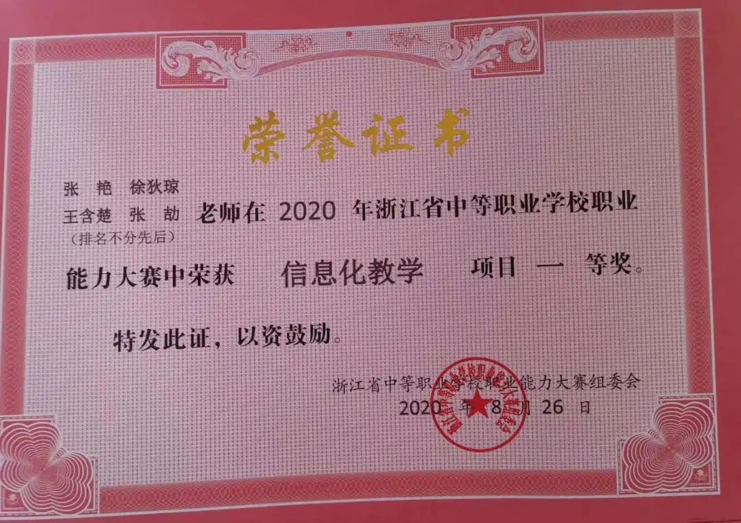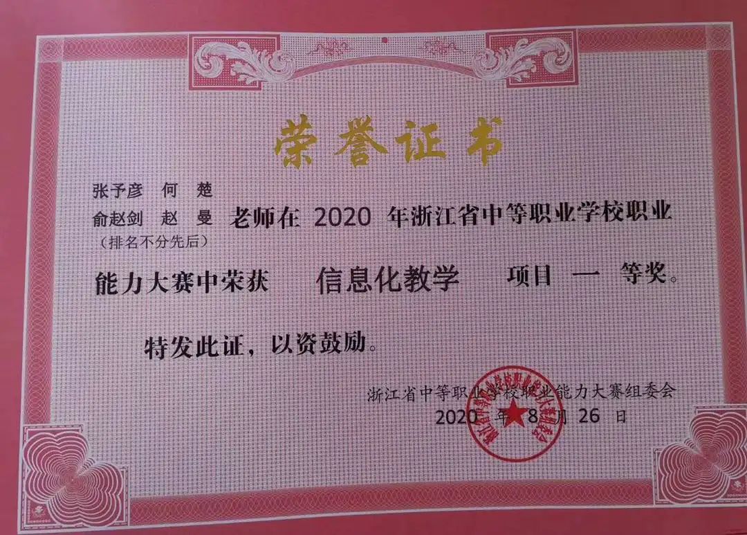 2020年8月26日, 在浙江经济职业技术学院举办的2020年浙江省中等职业学校职业能力大赛信息化教学赛项中,诸暨市职教中心公共基础课程组(公共艺术)、专业基础课程组(教育类)、绍兴护士学校专业基础课程组(医药卫生类)等三个项目喜获一等奖,昂首挺进国赛。浙江省14个国赛名额中,绍兴市获五个一等奖,五个项目进入国赛。