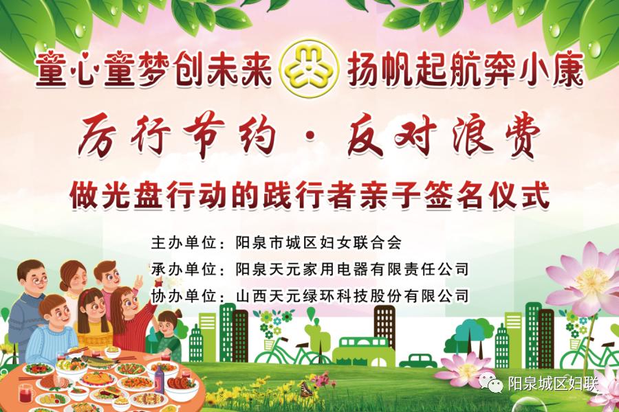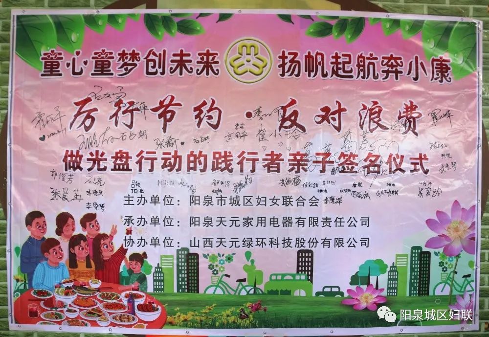 为深入贯彻落实习近平总书记对制止餐饮浪费行为作出的重要指示精神,进一步弘扬中华民族勤俭节约的传统美德,牢固树立节约光荣,浪费可耻的意识,8月21日,城区妇联联合阳泉天元家用电器有限责任公司、山西天元绿环科技股份有限公司,在平定县张庄镇新村村山西天元城市矿产集聚园区德善斋开展阳泉市城区“童心童梦创未来,扬帆起航奔小康”暑期亲子系列主题活动——“厉行节约,反对浪费,做光盘行动的践行者”亲子签名仪式。区妇联主席葛蕊参加活动并讲话。
