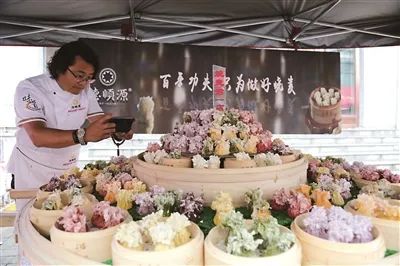 看过丰富多彩的开幕式,市民和游客移步到烧卖展示区,这里名品荟萃,广为人知的德顺源、老绥元制作了五颜六色的烧卖摆在醒目位置,人们争相拍照留念;新晋网红品牌——聚腾源烧卖的高颜值大厨吸引年轻游客了解烧卖文化;朵朵鲜烧卖展示台前正在开展一场包烧卖“大赛”,00后小伙挑战60后阿姨,小伙包的烧卖有模有样,传承在这一刻悄然发生。
