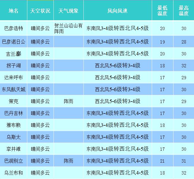 8月28日夜间至29日白天:晴转多云,额济纳旗有小雨,阿右旗、阿左旗、腾格里开发区有中雨,阿左旗西北部、高新区、乌兰布和示范区及贺兰山沿山有大雨,西北风4-5级。