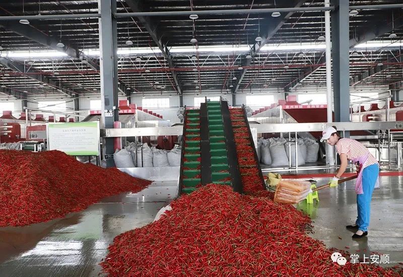 “轰轰轰”。在位于西秀区的贵州秀辣天下农业有限公司里,红彤彤的辣椒堆积如山,生产线上的辣椒井然有序。