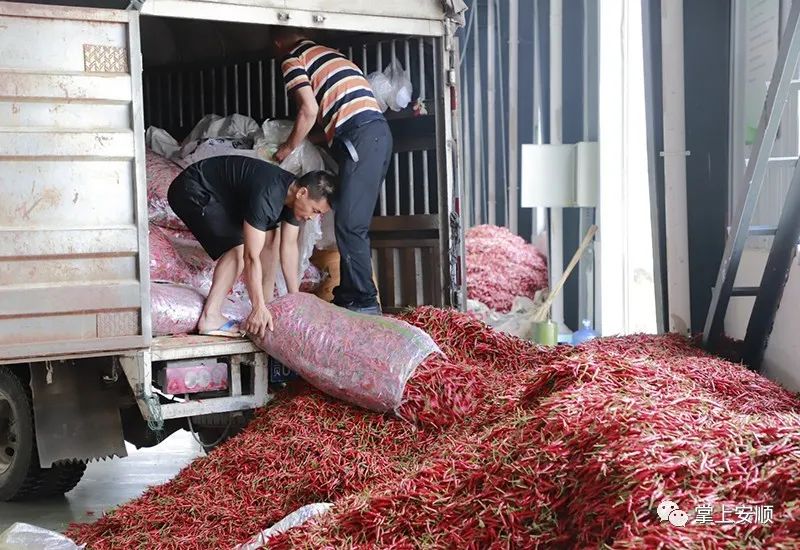 在平坝区天龙镇农产品交易市场,四川经销商田维志介绍:“安顺的辣椒品质好,口感佳,辣椒丰产期每天可从天龙镇农产品交易市场收集15吨辣椒销往成都蒙阳国际农产品交易中心,每年可在该地收购约900吨辣椒。”