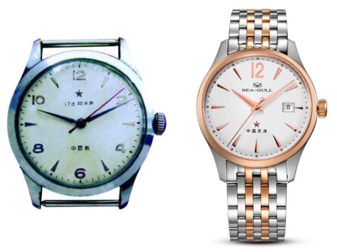 △左为1955年中国第一只自制手表“五星表”右为海鸥表60周年纪念款