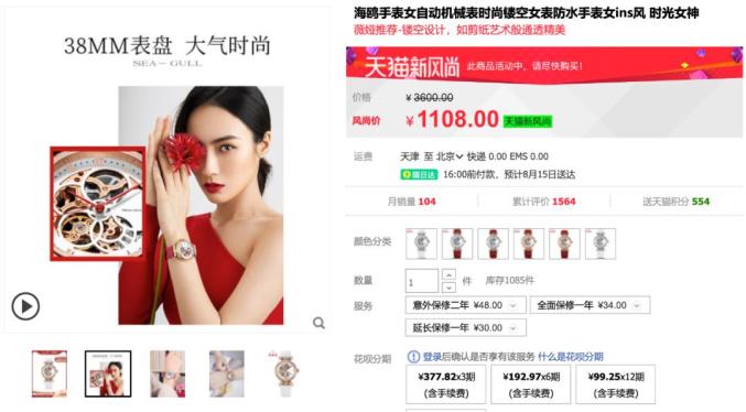 现在购买,天猫旗舰店活动价¥1108的「时光女神」手表限时活动价仅¥949。