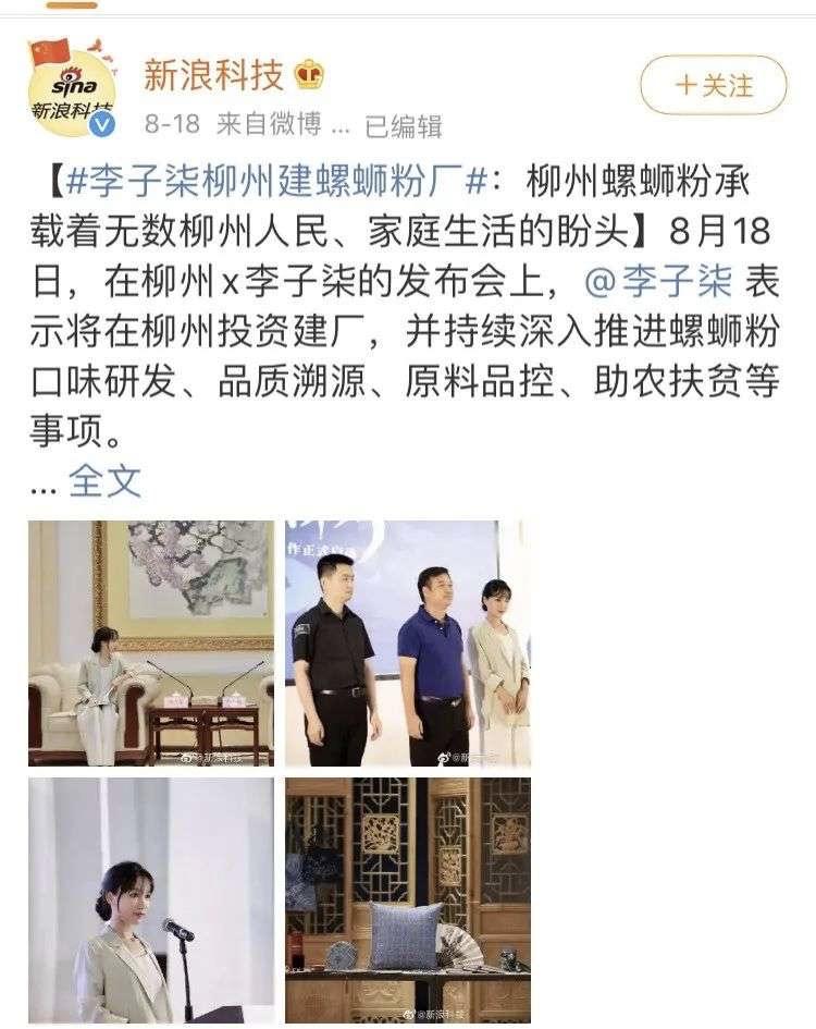 10天前,柳州政府与李子柒品牌召开了新闻发布会宣布在柳州投资建造螺蛳粉线下工厂。发布会上,李子柒品牌创始人李子柒表示,柳州螺蛳粉不仅是地方非遗美食,也是无数人民的希望与盼头,更是扶贫助农事业的重要载体。