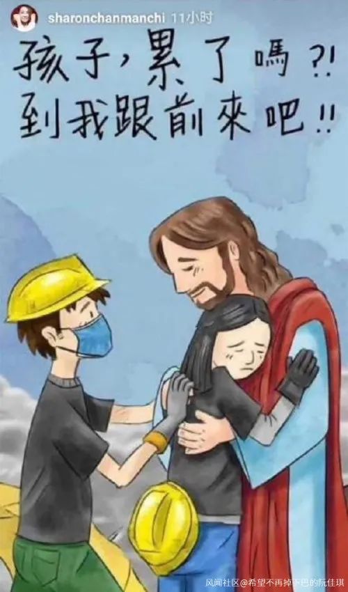 图中形似耶稣的男子,拥抱安慰着两个无论是衣着还是装备都与暴徒如出一辙的年轻人,配文还写道“孩子,累了吗?到我跟前来吧!”