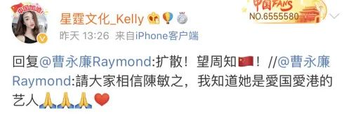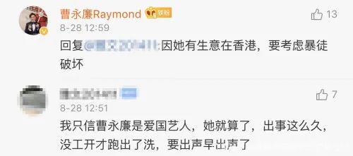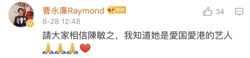 8月28日,爱国港星曹永廉在微博上为好友发声证明,解释称陈敏之许久未作出回应,是因为担心在香港的生意会遭到暴徒破坏,不用怀疑她的立场。