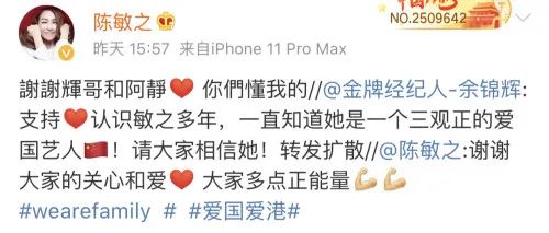 此后还有诸多圈内人士出面为陈敏之澄清作证,她自己也转发了表态视频,并配上了“爱国爱港”的热搜词。