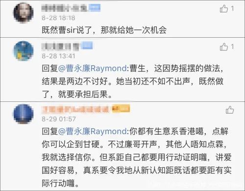 话都说到这个份上了,再加上有曹永廉这些出了名的爱国艺人做担保,虽然仍有网友认为陈敏之是“两面讨好”,但大部分人还是表示愿意相信,并且希望她不光是把“爱国爱港”挂在嘴上,而是真正付诸行动。