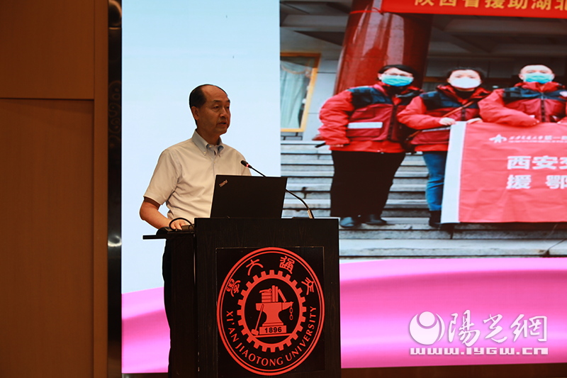 西安交通大学副校长颜虹首先致辞,他说到,新冠肺炎疫情汹涌来袭,广大医务工作者、疾控工作者和科技人员勇敢站在抗击疫情战场最前沿,交大302名勇士闻召而动、临危不惧、辞别亲人,向着武汉勇敢逆行,抱着以命换命的誓死决心,勇敢扛起了健康所系、性命相托的医者使命,救死扶伤、力挽狂澜,成为当之无愧的国之肝胆,这正是交大医学“兴医强国”人文精神的真实写照,他们为人类卫生健康共同体做出了交大、陕西乃至中国的贡献,向所有抗疫勇士致敬。