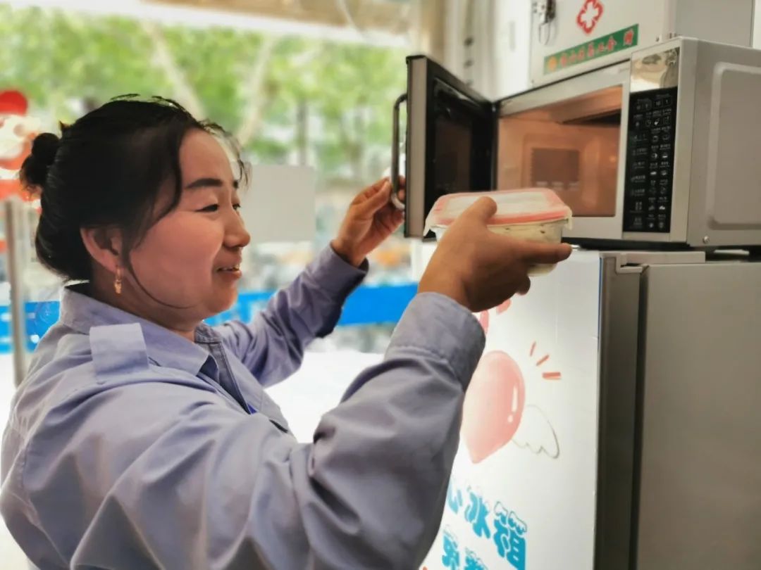 一个普通工作日的中午,记者来到了友谊路街道一处户外职工爱心接力站,在爱心接力站里见到了正在热饭的街面停车管理员辛娥荣。说起给她带来便利的这个爱心接力站,辛大姐情不自禁地竖起了大拇指。“我们每天在马路上要待十多个小时,又不能长时间离开工作区域。同事讲这里有冰箱可以放饭菜,又能帮忙热饭热菜,我就来了。天热容易中暑,徐姐还很贴心地准备了凉茶、盐汽水、板蓝根,真的非常暖。”辛娥荣满心欢喜地告诉记者。