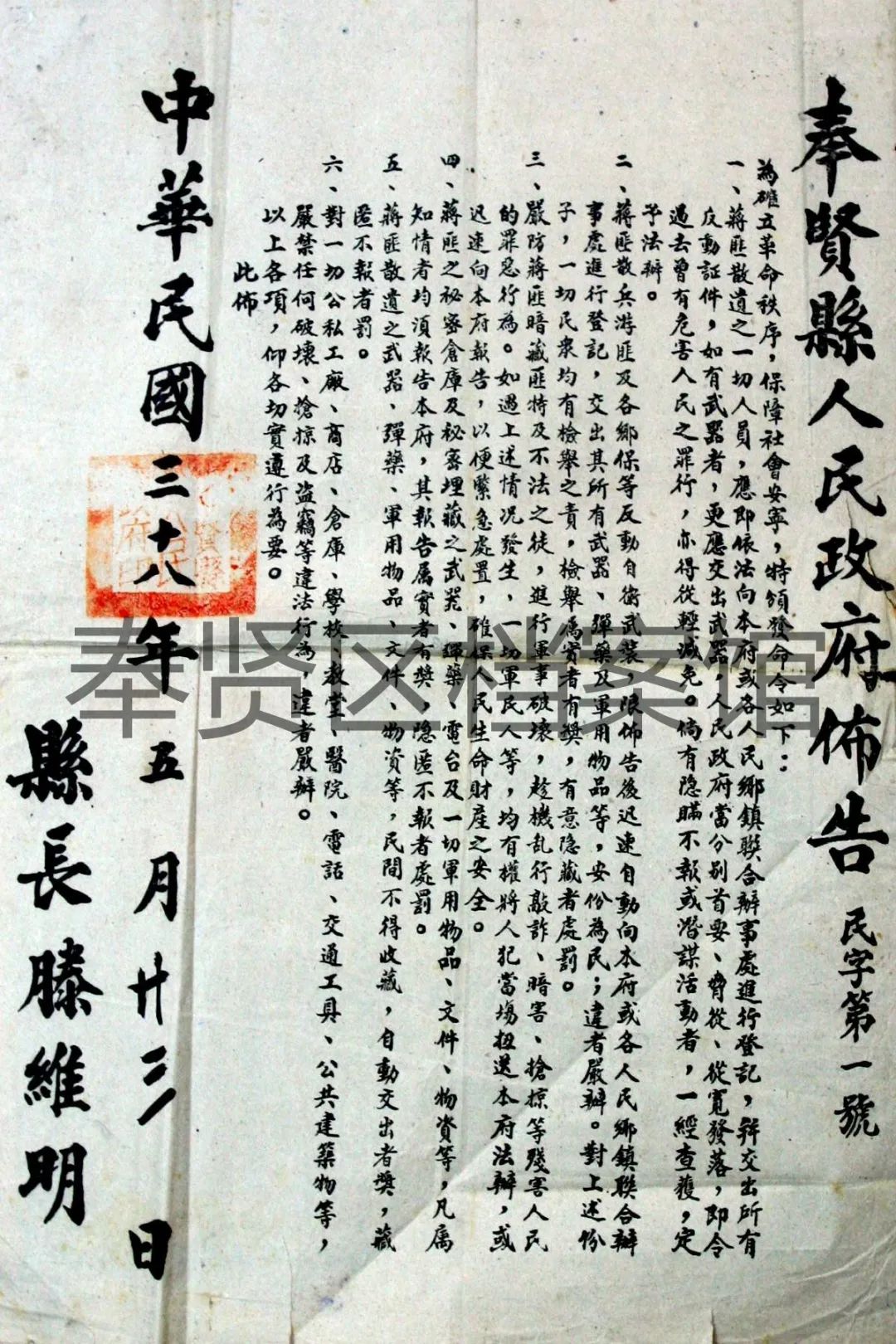 原标题:《四史故事|珍贵史料,看看奉贤建立人民政权后,第一任县长发布的第一份公告~》