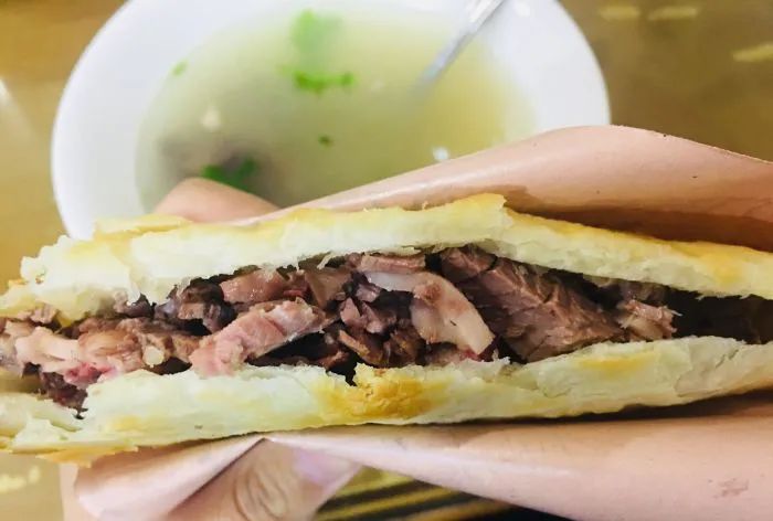 酥脆的火烧夹着肥瘦相间的驴肉,