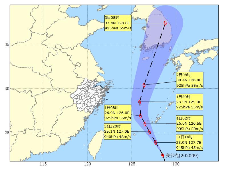 29日20时加强为强热带风暴,30日5时加强为台风,20时加强为强台风,今天8 时其中心位于舟山东南方向约1052公里的西北太平洋洋面上,就是北纬22.5度、东经128.5度,中心附近最大风力14级(42米/秒),中心最低气压为950百帕,七级风圈半径200~350 公里,十级风圈半径100公里。预计,“美莎克”将以每小时25~30公里的速度向北偏西方向移动,强度逐渐加强,最强可达超强台风级。“美莎克”台风明天凌晨进入东海南部,尔后沿东经126度附近向偏北方向移动,2日上午越过嘉兴市同纬度,并继续向北偏东移动。