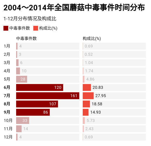 根据梳理相关新闻、文献发现:西南省份多发蘑菇中毒事件已是由来已久。一项对2004-2014年的蘑菇中毒事件的研究数据表明:从蘑菇中毒事件发生的季节来看:夏秋季节中毒事件多发,这也是我国大部分地区适宜蘑菇生长的高温、多雨季节,下图所示: