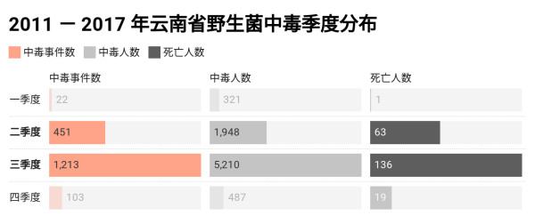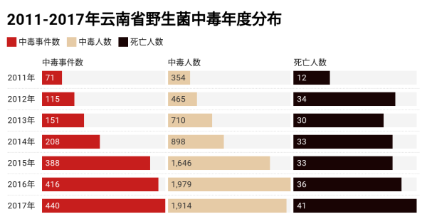数据表明:2011-2017年之间,发生在云南的蘑菇中毒事件数、中毒人数呈增加趋势,情况非常不乐观。