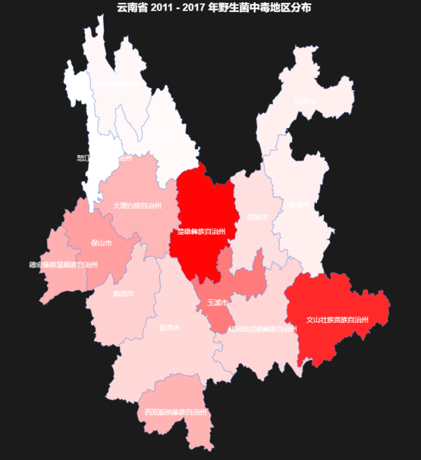 统计数据表明:云贵川三省占全国蘑菇中毒事件总数的近60%。云南一省独占全国蘑菇中毒事件的38%。在防治蘑菇中毒上,这些区域也是最需要关注的。云南:蘑菇中毒事件高发