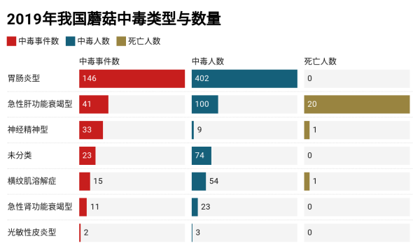 今年2月份,中国疾控中心发布的研究数据显示:2019年发生在我国的蘑菇中毒事件,引发中毒的蘑菇多以肠胃炎型、急性肝功能衰竭型等为主。肠胃炎型虽然数量较多高发,但致死最多的是急性肝衰竭型蘑菇中毒。下图所示:
