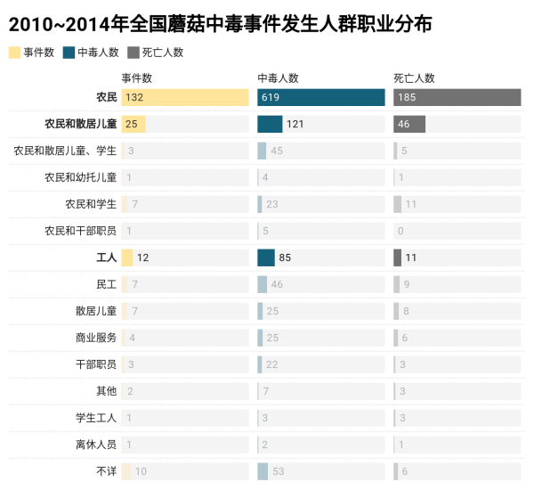 中毒人群从蘑菇中毒人群来看,参考2010-2014年的数据,其中:农民、散居儿童学生和工人,为多发人群。这或与其较为容易接触到野外的毒蘑菇和辨识能力有关,低龄儿童学生或多为与家长在家中食用导致中毒。