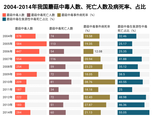 7月25日,云南卫健委发布消息:2020年5月至7月20日,云南省野生蘑菇中毒事件共273起 ,其中有12人因中毒身亡。根据同时期新冠疫情的报告,截至2020年8月1日,云南省新冠累计致死人数2人,远低于野生菌中毒致死人数。今年中国疾控中心的一项研究表明:蘑菇中毒正在成为中国最严重的食品安全问题之一,几乎占所有食物中毒死亡人数的一半。食用野生蘑菇中毒已是引发公众和疾控部门关注的公共卫生问题。