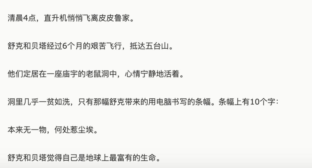 小说的结局部分,玩遍世界兄弟终于不想隐瞒感情,当着老婆的面表白了。也许是真的历经艰险看破红尘,才让这两位童年英雄最后相约五台山,写下了“本来无一物,何处惹尘埃”的横幅。