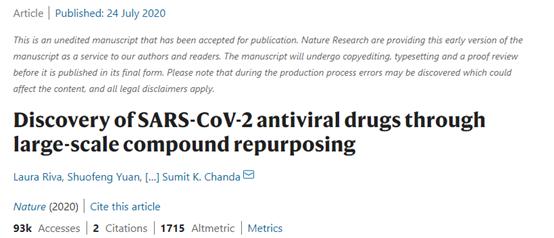 2020年7月24日,发表在《Nature》的一篇文章通过筛选各种已经批准上市的药物,发现了几种可能对疫情有帮助的药物。文章题目为Discovery of SARS-CoV-2 antiviral drugs through large-scale compound repurposing。文章中文译名为《探究可能具有SARS-CoV-2抗病毒效果的大规模药物筛查再利用》。