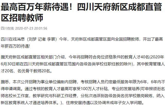 据报道,今年,四川省天府新区成都直管区面向全国招聘教师,开出了最高年薪百万的待遇。据天府新区成都直管区相关部门介绍,今年将招聘符合岗位资格条件的教育人才40名(2020年6月30日前在四川天府新区成都直管区范围内各级各类学校任职任教的除外),其中教育管理人才20名、名优骨干教师20名。